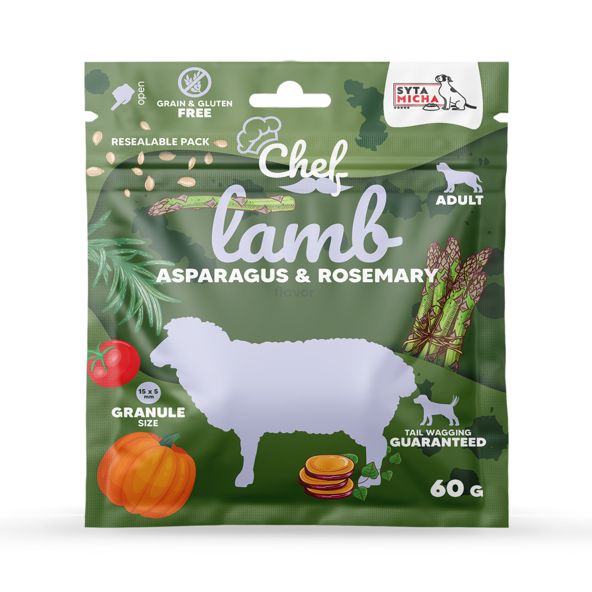 Syta Micha Jagnięcina, szparagi i rozmaryn to bezzbożowa i pełnoporcjowa formuła dla każdego dorosłego psa. To odpowiednio zbilansowany posiłek, w którym na pierwszym miejscu znajdziemy aż 60% mięsa jagnięcego, doskonałego źródła białka, niezbędnego dla utrzymania masy mięśniowej i prawidłowej masy ciała.