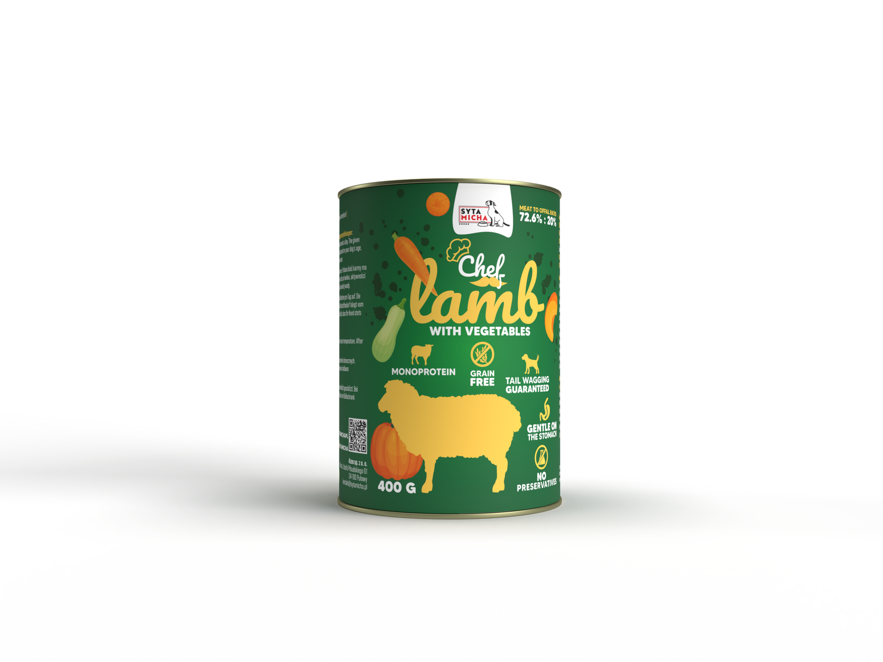 A Chef bárányhúsos zöldséges nedves tápban a hús mellett diétás zöldségek is találhatók.