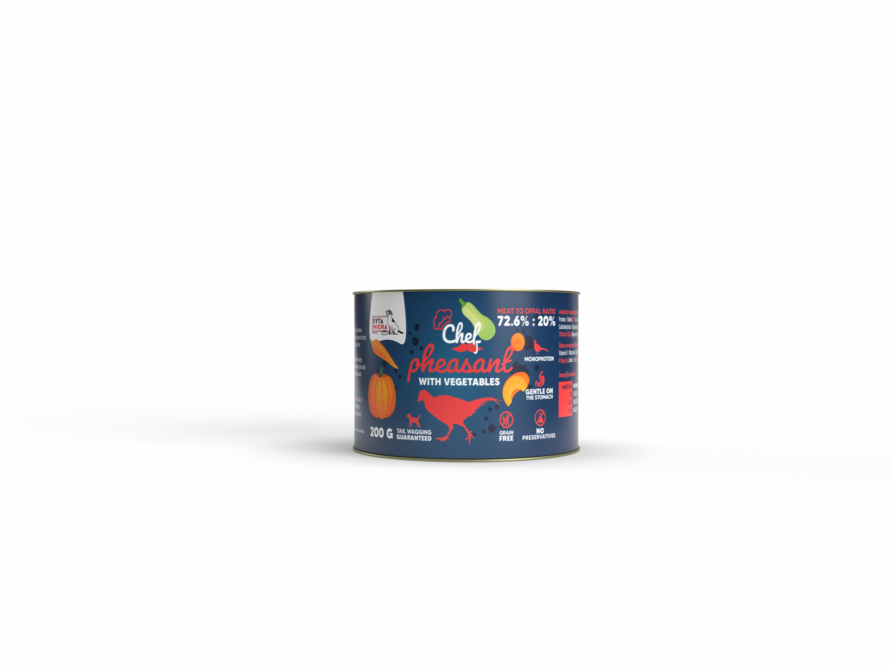 W linii Chef od Sytej Michy znajduje się aż 92,6% produktów pochodzenia zwierzęcego, w stosunku 72.6% mięsa mięśniowego bażanta do 20% podrobów z bażanta (10% żołądki, 5% serca, 5% wątróbka).