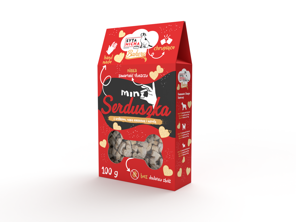 Mini serduszka sono biscotti per cani fatti a mano e cotti al forno. Incredibilmente croccanti, snack di piccole dimensioni, il cui ingrediente principale è costituito da carne tenera di coniglio, farina di cocco senza glutine e frutti prebiotici come mele e albicocche, che promuovono una sana microflora intestinale. Tra gli altri ingredienti salutari, nei mini serduszka troviamo il finocchio.