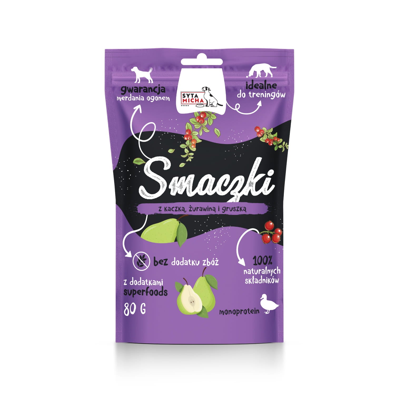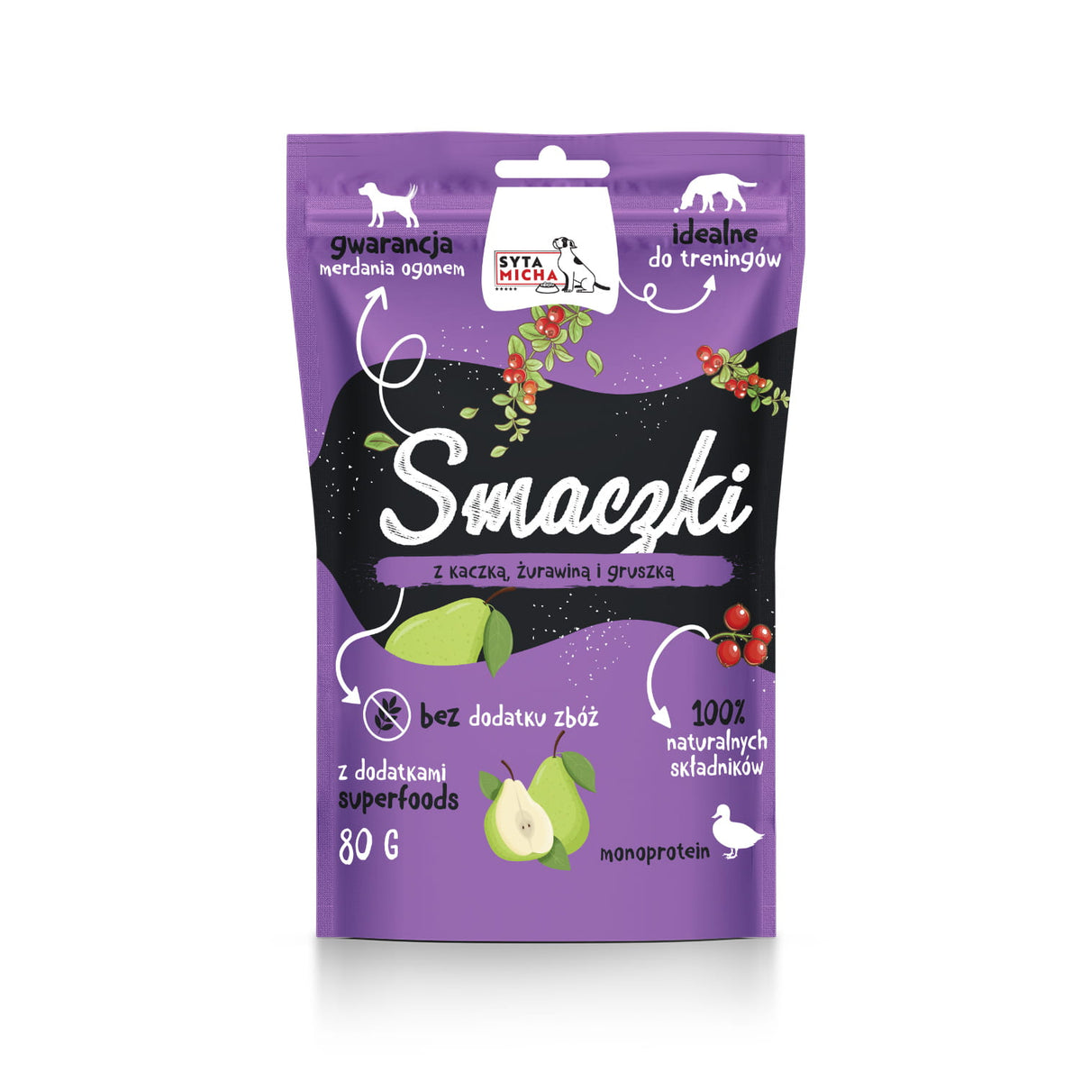Skład: kaczka 90%, żurawina 3%, gruszka 3%, gliceryna roślinna, minerały