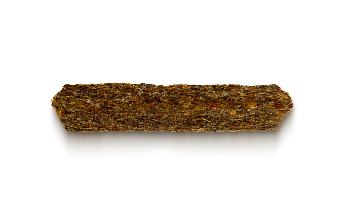 Skład: pasternak 25%, skrobia ziemniaczana 20.2%, marchew 20%, skóra wołowa 10%, chia 10%, skóra z kozy 4%, babka płesznik 4%, struś suszony 2%, płatki drożdżowe nieaktywne 2%, siemię lnu 1%, zagęszczony sok z wisni 0.5%, kurkuma mielona 0.5%, kadzidłowiec indyjski 0.5%, aromat gruszkowy 0.3%