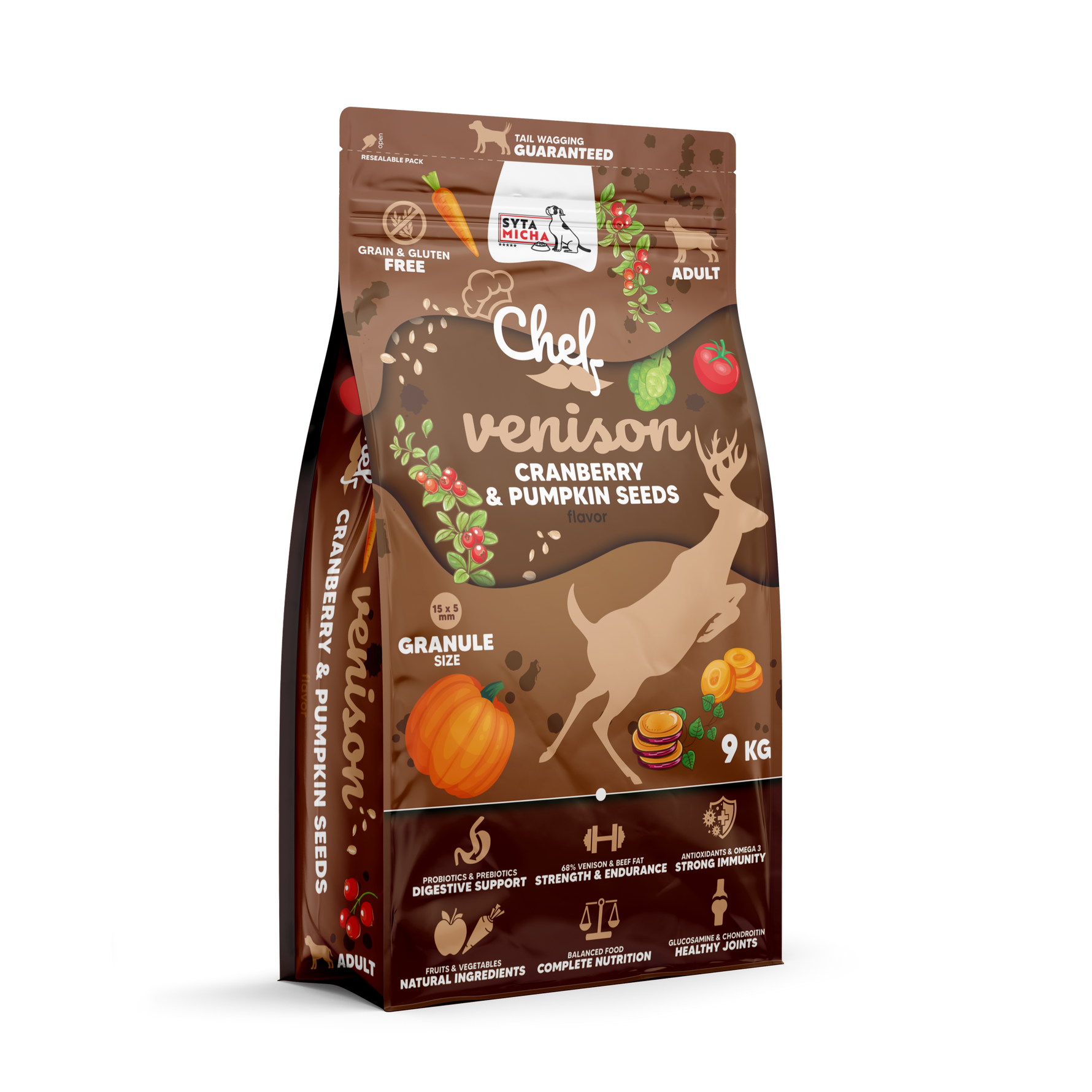 Syta Micha Dziczyzna, żurawina i pestki dyni to bezzbożowa i pełnoporcjowa formuła dla każdego dorosłego psa. To odpowiednio zbilansowany posiłek, w którym na pierwszym miejscu znajdziemy aż 60% dziczyzny, doskonałego źródła białka, niezbędnego dla utrzymania masy mięśniowej i prawidłowej masy ciała.